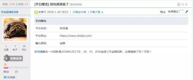 此前投资人在网贷天眼社区反映,财佰通最后一次回款是2018年1月17日,18、19、20日连续三天逾期回款。