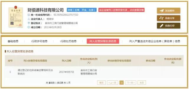 需要指出的是,财佰通科技有限公司2017年9月7日因“通过登记的住所或者经营场所无法联系”,被泉州市工商行政管理局鲤城分局列入经营异常名录,至今未被移出。