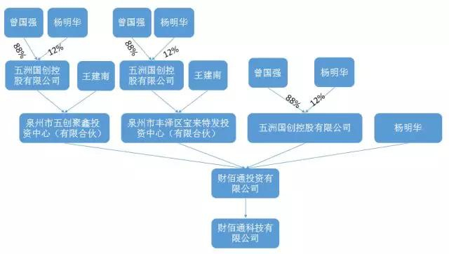 追溯财佰通的背后实控人,网贷天眼注意到了一个公司和3个重要人物,分别为“五洲国创控股有限公司”和杨明华、曾国强、王建南。五洲国创控股有限公司成立于2014年3月3日,注册资本5000万元,法人曾国强,曾国强持股88%,杨明华持股12%。同时,五洲国创控股有限公司又与王建南共同成立了数个公司,具体持股比例不详。不过,无疑的是,曾国强、杨明华和王建南三人是这个复杂的企业网络的核心。