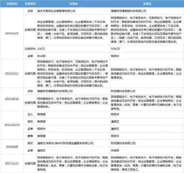 成立至今,财佰通曾进行多次变更工商信息,2014年3月21日名称从最初的“泉州天堂商业运营管理有限公司”变更为“福建财佰通智能科技有限公司”,直至2015年8月18日才变更为“财佰通科技有限公司”;经营范围也经历过4次变更,从最初的商业运营管理、道路运输、销售等,变更为“网络智能技术、电子商务技术、电子信息技术的开发;智能系统集成及软件开发;商业运营管理;企业营销策划;企业管理咨询;批发、零售:计算机软硬件及辅助设备;电子设备制造;通信工程施工。”