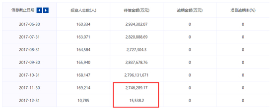 统计截止2017年12月31日的数据显示,代表平台体量和规模的聚宝汇待偿余额从11月底的274.63亿骤减到了12月底的1.55亿,等于规模缩水了176倍。