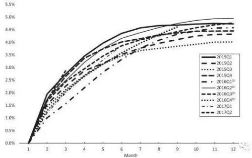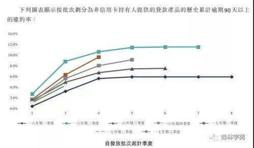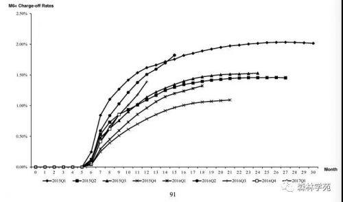 但其中有两条很危险的曲线要注意。2016年第2季度曲线和2015年第4季度的曲线一直在往上飙升,曲线斜率越来越大,没有减缓的趋势,这两条线代表的业务坏账当时可能有问题。还有一种可能就是,这是短期数业务。