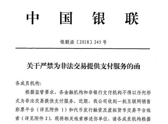 银联在文件中要求,成员机构不得以任何形式为非法交易提供服务,认真做好全面自查整改工作,若排查发现存在为互联网销售彩票平台、代币发行融资及虚拟货币交易平台等非法交易提供支付服务的,应立即停止合作。