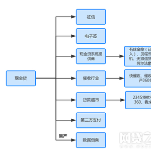 随着现金贷行业的迅速崛起,其相关产业也得到高速发展。如下图所示,与现金贷相关的产业主要有系统提供商、催收行业、助贷机构、征信机构等,且因为现金贷平台具有强大的用户流量,还衍生出了黑色产业如数据倒卖,致使用户信息泄露。