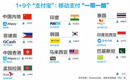蚂蚁金服官方介绍,过去的5年中,支付宝一方面服务出境游的中国用户,连接全球54个国家和地区的数十万商家帮助国人实现“一部手机游遍全球”;另一方面,在一带一路沿线国家和地区不断落子,支付宝携手当地伙伴成功打造9个本地版“支付宝”,包括印度Paytm,巴基斯坦Easypaisa,菲律宾GCash,孟加拉bKash等: