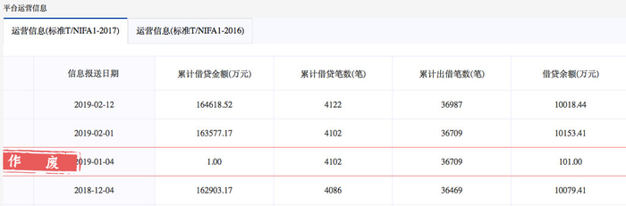 登记披露平台信息显示,截至2019年1月31日,平台累计借贷金额16.46亿元,借贷余额1亿元,利息余额648.62万元,逾期金额为0,累计代偿金额1.64亿元。