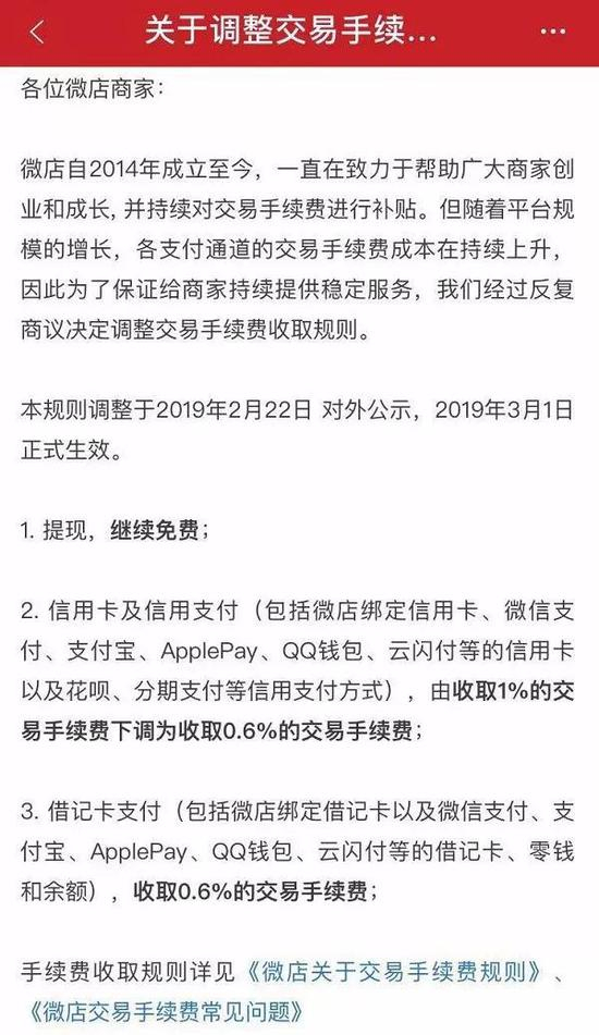 日前,社交电商平台微店发布调整交易手续费的公告称,3月1日起,取消针对借记卡的交易手续费补贴,收取0.6%的交易手续费。