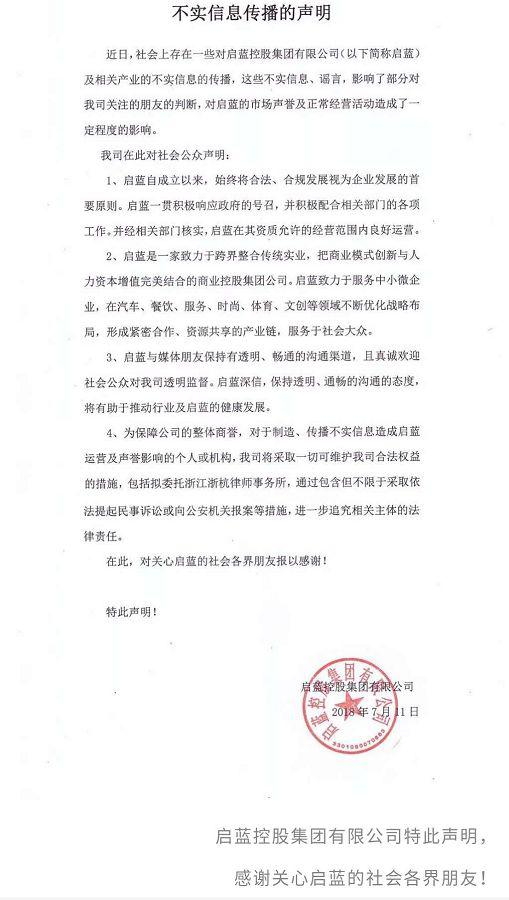 2018年7月11日,启蓝控股还专门在其官网微信上发布一则声明,称其在资质允许的范围内运营良好。不过,很快网上就爆出汪麟跑路的新闻。