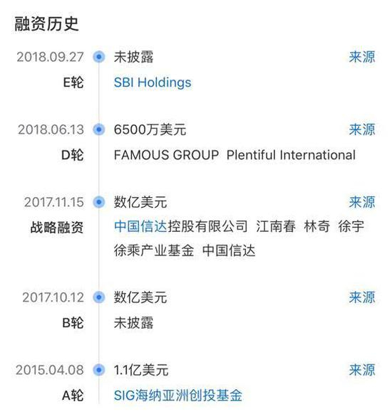 根据过往媒体的公开报道,玖富集团过去至少完成过5轮融资,投资方中既包括SIG海纳亚洲创投基金这样的一线美元基金,也包括中国信达(香港)控股有限公司这样具有国有资产管理背景的股东,同时也包括全球金融科技公司SBI集团等战略投资方。此外,玖富集团还曾自称与IDG资本这样的顶级VC完成投资交割。