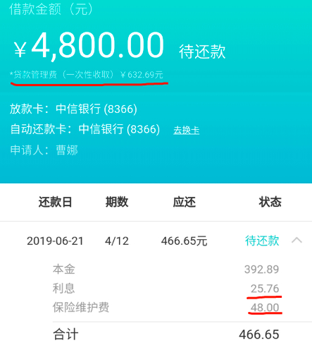 我们查看账单详情后发现,平台方以及长治银行收取的费用主要包括一次性收取632.69元贷款管理费,本质上就是砍头息,占本金比例约13%,每月收取48元保险维护费,而贷款利息每月只有25.76元。与上面计算结果吻合,利息之外的成本数倍于利息。