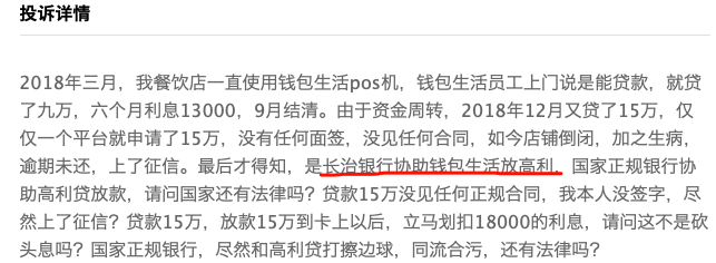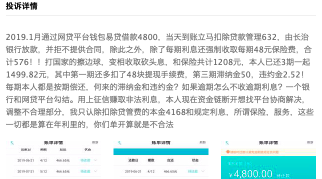 6月19日,有借款人在聚投诉官网发帖表示,自己从钱包易贷上借款4800元,放款方为长治银行,资金到账后被立即扣掉贷款管理费632元,借款人每月需要还款466.65元,首月额外多还48元提现手续费。