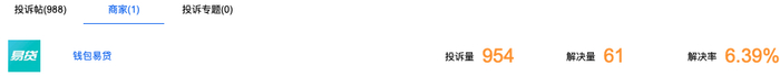 虽然有上市公司和银行加持,钱包小贷的业务依然存在很大问题,旗下借款平台之一钱包易贷在聚投诉上的投诉量多达近千条,解决率仅有6%,投诉内容主要涉及高利贷、砍头息、暴力催收等。