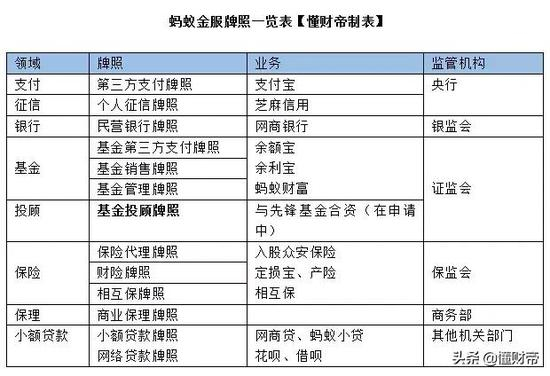 比如,蚂蚁金服持有第三方支付、小贷、保险、基金、银行等牌照,就属于“金融控股”之列。