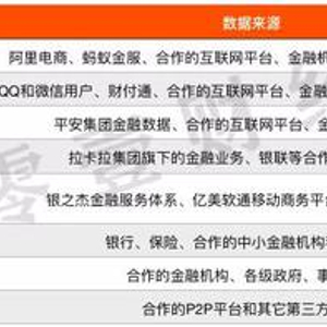 8家股东之中, 芝麻信用、腾讯征信和前海征信的数据主要来源于自身体系内。阿里体系内的数据包括淘宝的网购数据,支付宝的各类金融数据,涵盖了网购、转账、理财、信用卡还款、水煤电缴费、出行和社交等各方面;腾讯体系内的数据包括QQ、微信的社交数据及财付通的各种金融数据;前海征信的数据主要来源于平安集团内,平安旗下的子公司涉及保险、银行、信托、证券和基金等各个金融领域,同时还开拓了陆金所、金融壹账通、壹钱包等金融科技业务。
