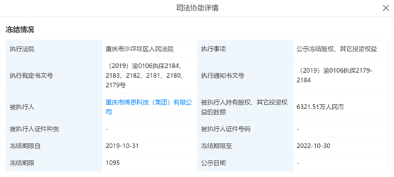 近日,天眼查信息显示,由于大股东重庆市博恩科技(集团)有限公司(下称“博恩集团”)成被执行人,持牌支付机构重庆易极付科技有限公司(下称“易极付”)部分股权被冻结,冻结的股权数额为6321.51万元人民币,占易极付全部股权的63.21%。冻结期限从2019年10月31日至2022年10月30日。