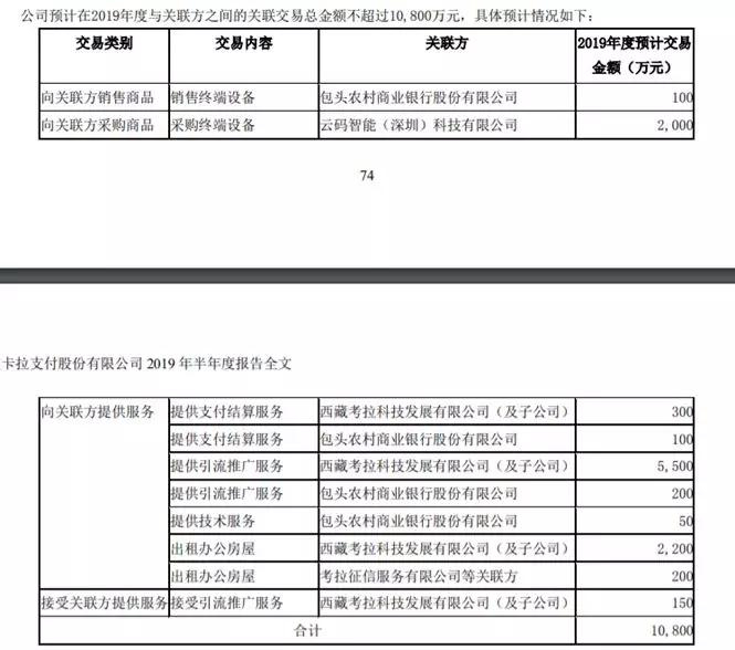 被切断身份证核验接口,“易分期”业务陷入停滞,对拉卡拉真的没有影响吗?拉卡拉2019年半年报显示,拉卡拉与西藏考拉科技发展有限公司之间存在关联交易,拉卡拉预计,2019年通过向西藏考拉提供支付结算服务(300万元)、引流推广服务(5500万元)、出租办公房屋(2200万元)累计金额达8000万元。