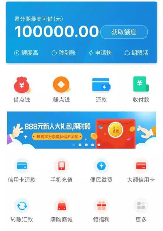 互金商业评论下载拉卡拉APP后发现,拉卡拉APP首页霸屏画面是“易分期”,首页顶部和中间、下方均有“易分期”、“借点钱”的入口。