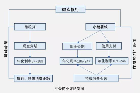 一是在原有现金分期业务基础上,植入了信用支付产品-腾讯版“花呗”;此前曾有媒体报道称,微信内部在孵化信用支付产品“分付”,但迟迟没有下文。现在看,“小鹅花钱”更像是腾讯未来独立信用支付产品的“阶段性过渡产品”,而将其置入联合贷款架构中,或许也有低调处理的考虑。