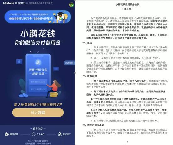 互金商业评论注意到,微众银行联合持牌消费金融机构推出的一款信用支付+现金贷的混合产品“小鹅花钱”正通过腾讯视频向会员限时推广。
