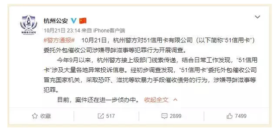 10月21日,杭州公安官方微博发布一则警方通报,通报显示,杭州警方对51信用卡有限公司委托外包催收公司涉嫌寻衅滋事等犯罪行为开展调查。