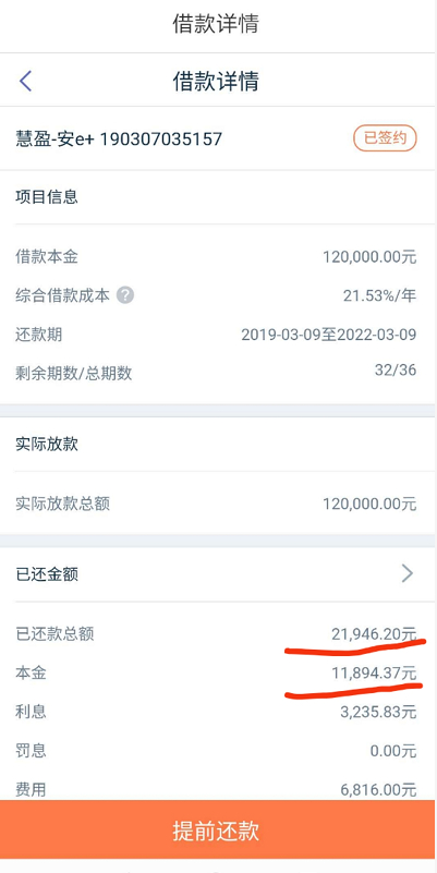 根据王先生提供的借款详情截图,其在进行到第32期还款时,已还款总额为21946.2元。其中,本金已还11894.37元,已还利息为3235.83元,而已还费用却高达6816元。