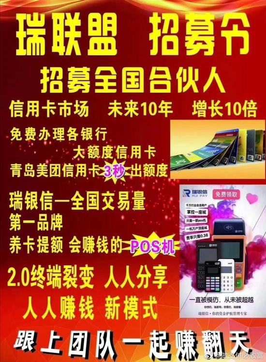而瑞银信旗下的瑞联盟,主要通过“发展下级代理商”来展业,平台称“总部直签,分润日结”,“轻松周入过万,百分百无套路”。