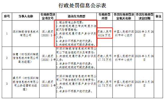 行政处罚信息显示,瑞银信因存在未按规定建立有关制度办法或风险管理措施、未按规定履行客户身份识别义务等违法违规行为,被央行深圳支中心罚款6124万元。