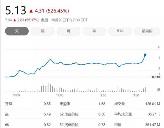 上午涨势结束后,微贷网下午回落至3.3美元后震荡,一直到尾盘,再次出现快速拉升,最高至5.49美元,并以5.14美元收盘,全天涨幅高达526%!
