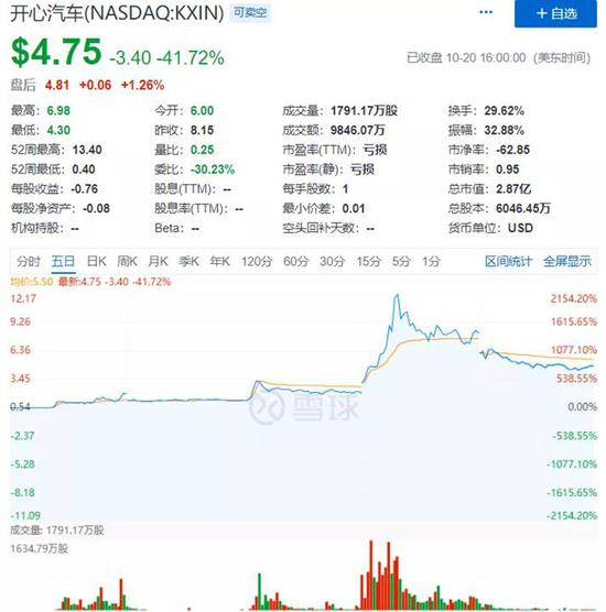 19日,开心汽车从3.3美元涨到13.4美元,涨幅400%多,但收盘就跌回到8美元;20日,开心汽车暴跌42%,目前价格4.75美元。