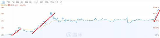 刺激吗?更刺激的还在后面。上午10:50左右,微贷网出现了一波更夸张的上涨,从1.4美元左右一口气涨到4.5美元,涨幅454%!也就是说,早上10万美元买入,一个上午已经变成了53万美元。