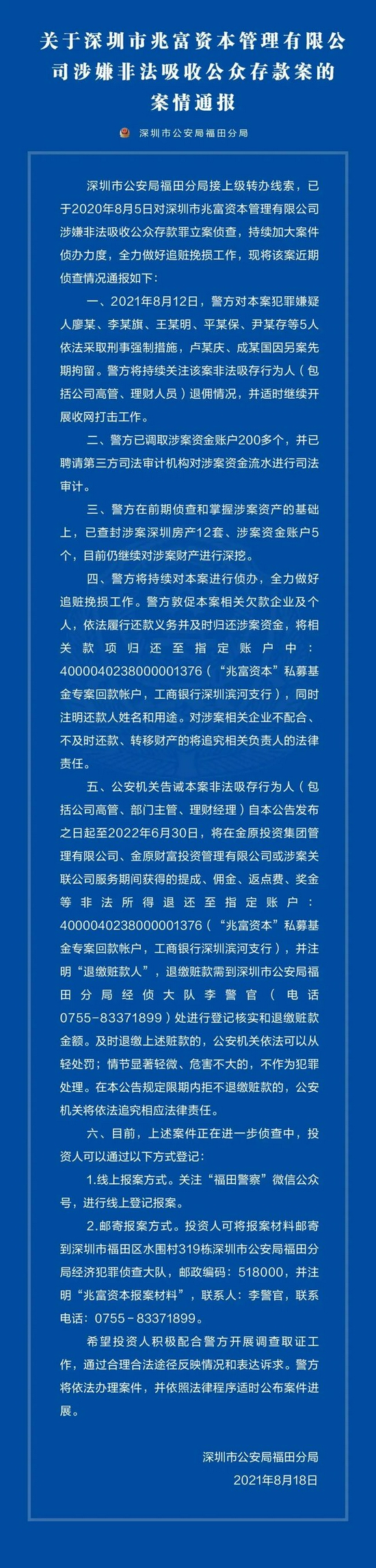 深圳市公安局福田分局接上级转办线索,已于2020年8月5日对深圳市兆富资本管理有限公司涉嫌非法吸收公众存款罪立案侦查,持续加大案件侦办力度,全力做好追赃挽损工作,现将该案近期侦查情况通报如下: