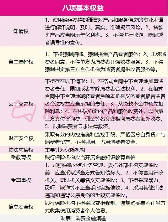 《管理办法》规定消费者的八项基本权益,包括知情权、自主选择权、公平交易权、财产安全权、依法求偿权、受尊重权和财产信息安全权。以及机构及管理人员违规的处罚也更加有法可依。