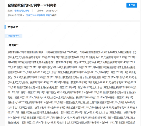 从裁判文书看,宁波银行放贷的年利率并不低。一则金融借款合同纠纷民事一审判决书显示,被告从2021年2月28日到2021年12月18日先后向宁波银行借款13次,共计20万元,年利率为15%或14%,逾期利率则为21%或22.5%。
