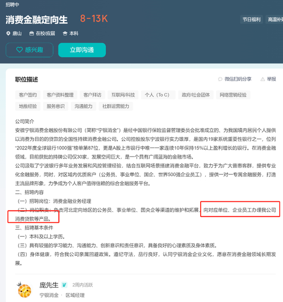 其中,“消费金融定向生”的招聘内容明确要求,消费金融业务经理“负责河北定向地区的公务员、事业单位、国央企等渠道的维护和拓展,向对应单位、企业员工办理我公司消费贷款等产品。”而这些群体,也是宁波银行“白领融”的主要目标客户,两个产品相辅助的意味浓厚。