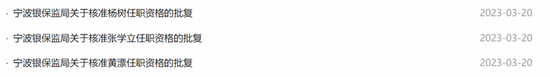 3月20日,宁波银保监局官网显示,该局核准了杨树、张学立、黄漂三人在的董事任职资格。