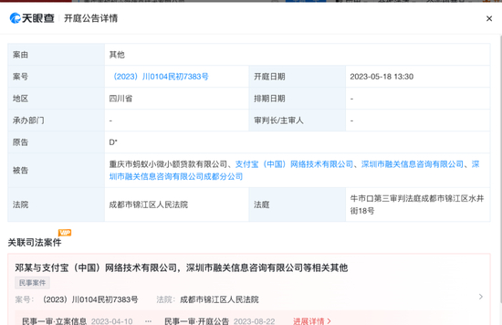 2023年5月,重庆市蚂蚁小微小额贷款有限公司同样被起诉,同时被告的还有深圳市融关信息咨询有限公司,该公司同样是负责催收的机构。