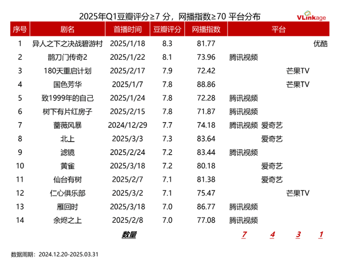 根据Vlinkage统计,2025年一季度豆瓣评分在7分以上,同时网播指数在70+的剧集中,腾讯视频包揽了7部,占比50%,由爱奇艺独家贡献的只有3部,这也从侧面印证爱奇艺的内容质量不理想,观众不买账。