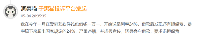 比如,有用户投诉:今年一月在爱奇艺软件钱包借钱一万一,开始说是利率24%,借款后发现还有担保费,费率算下来超出国家规定的24%,并虚假宣传,诱导客户借款,要求退担保费。