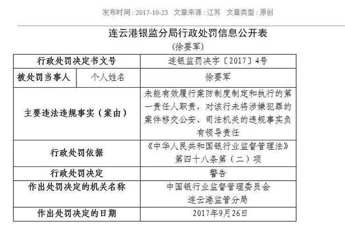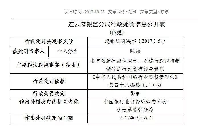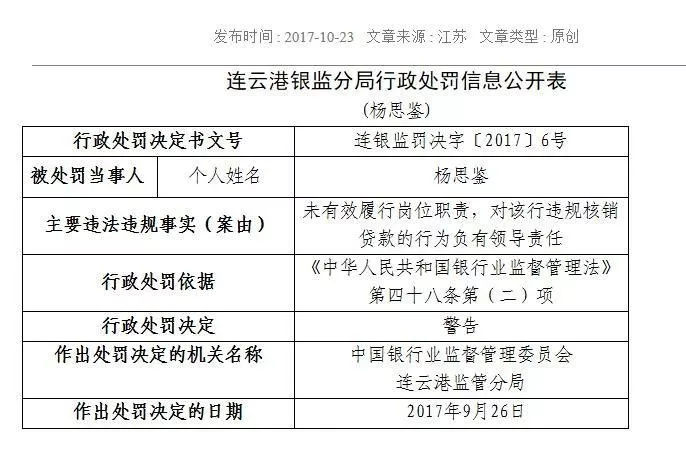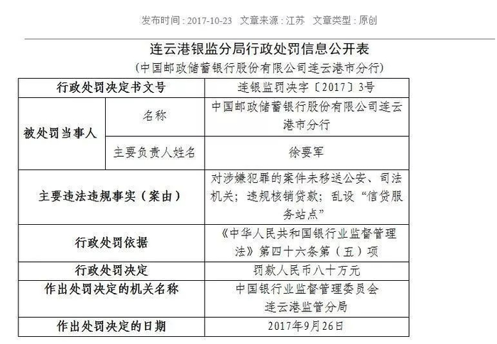 10月23日,江苏银监局又公开披露了两家银行的处罚情况,其中对邮储银行连云港分行的处罚尤其值得关注。