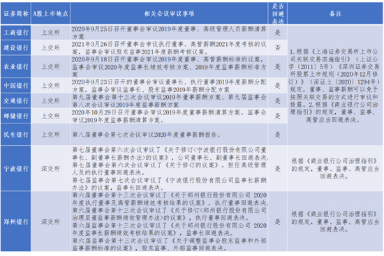 通过公开信息,小编查询了部分上市金融机构审议董事监事、高管薪酬时,董事监事高管的回避表决情况,具体如下: