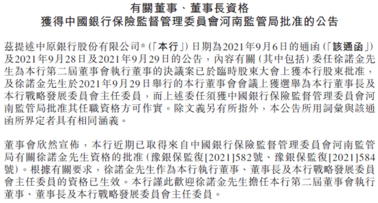 根据中原银行11月16日晚间发布的公告,徐诺金中原银行董事长的任职资格已于近期获河南银保监局核准。此前在中原银行9月29日举行的董事会会议上,徐诺金获选为该行董事长,彼时其任职资格尚需监管机构核准。