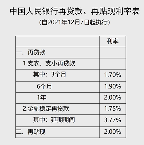 今日央行网站挂出再贷款、再贴现利率表显示,支农、支小再贷款自2021年12月7日起下调0.25个百分点,下调后3个月、6个月、1年期再贷款利率分别为1.7%、1.9%、2%。