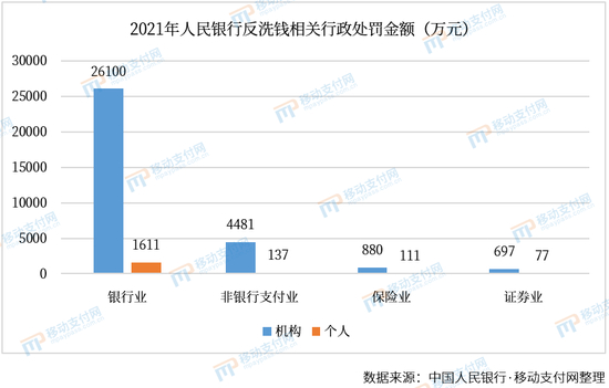 处罚共涉及银行业机构365家,罚款2.61亿元,处罚个人697人,罚款1611万元,两项罚款合计2.77亿元;涉及非银行支付机构12家,罚款4481万元,处罚个人17人,罚款137万元,两项罚款合计4618万元;涉及的保险业机构和证券业机构则分别为16家、8家,罚款合计金额分别为991万元、774万元。