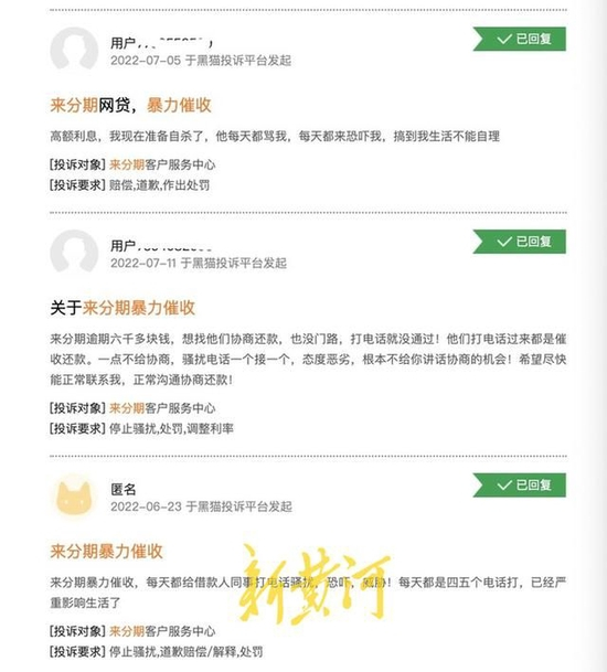 对此,新黄河记者致电“来分期”客服,关于“恶意催收”等问题,客服人员表示非用户不便回答。