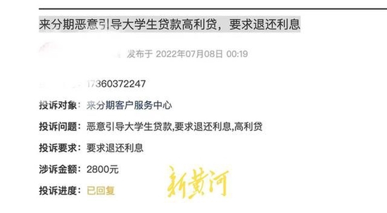 新黄河记者注意到,在黑猫投诉上,关于“趣分期”的投诉有100多条,而关于趣店另一款产品“来分期”的投诉达到29987条。在投诉信息中,可以看到多条“恶意催收”“骚扰短信”“无故扣款”等,其中还包括“来分期恶意引导大学生贷款”等投诉。
