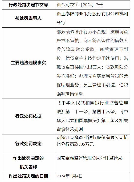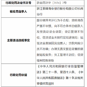 1月9日金融一线消息,国家金融监督管理总局浙江监管局行政处罚信息公开表显示,浙江泰隆商业银行股份有限公司杭州分行存在以下违法违规事实:1.部分绩效考评行为不合规;2.贷前调查严重不审慎,向不符合条件的借款人发放流动资金贷款;3.贷后管理不到位,信贷资金未按约定用途使用;4.贴现资金直接回流出票人;5.贷款风险分类不准确;6.办理无真实贸易背景的票据贴现业务;7.员工管理不到位;8.借贷强制搭售保险。