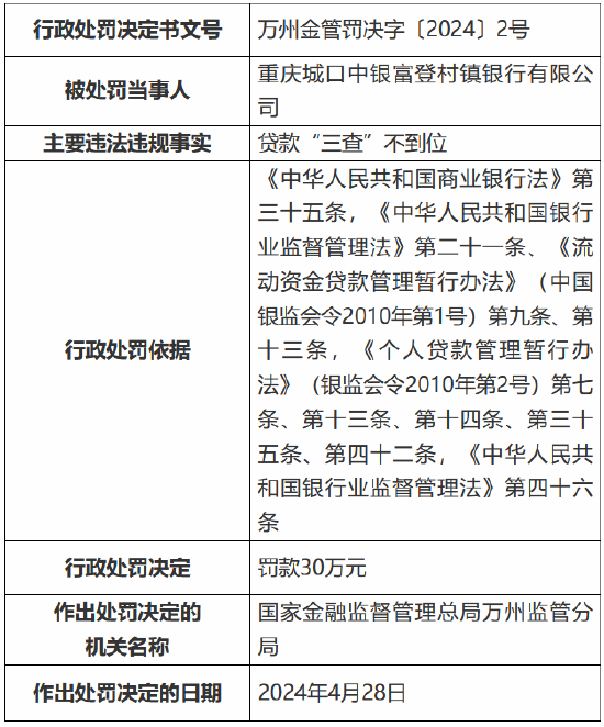 因贷款“三查”不到位 重庆城口中银富登村镇银行被罚30万元