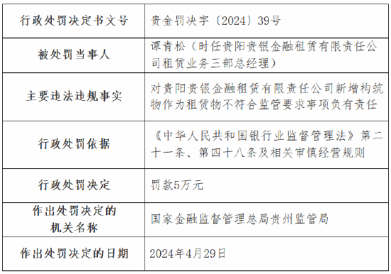 时任贵阳贵银金融租赁有限责任公司租赁业务三部总经理谭青松,对公司新增构筑物作为租赁物不符合监管要求事项负有责任,被罚款5万元。