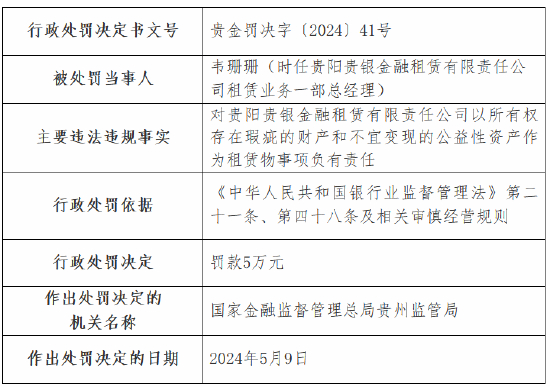 时任贵阳贵银金融租赁有限责任公司租赁业务一部总经理韦珊珊,对公司以所有权存在瑕疵的财产和不宜变现的公益性资产作为租赁物事项负有责任,被罚款5万元。