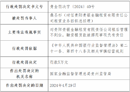时任贵阳贵银金融租赁有限责任公司租赁业务四部总经理桑圣杉,对公司租后管理不到位,融资租赁款被挪用事项负有责任,被罚款5万元。